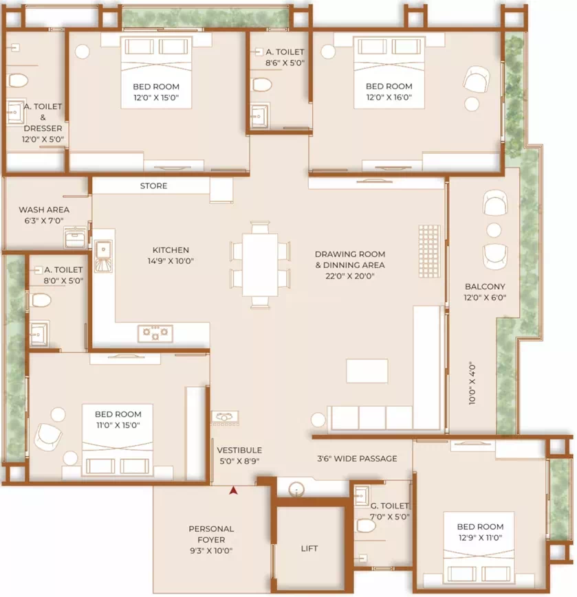 Spread across 1.23 acres with just 124 residences across three elegant buildings, Ganesh Vivanta brings a sense of spaciousness and privacy that discerning homeowners seek. The project features well-proportioned 3 BHK and 4 BHK homes with carpet areas typically ranging from around 1254 sq.ft. to 1600 sq.ft., thoughtfully planned to maximize natural light, airflow, and functional living space.